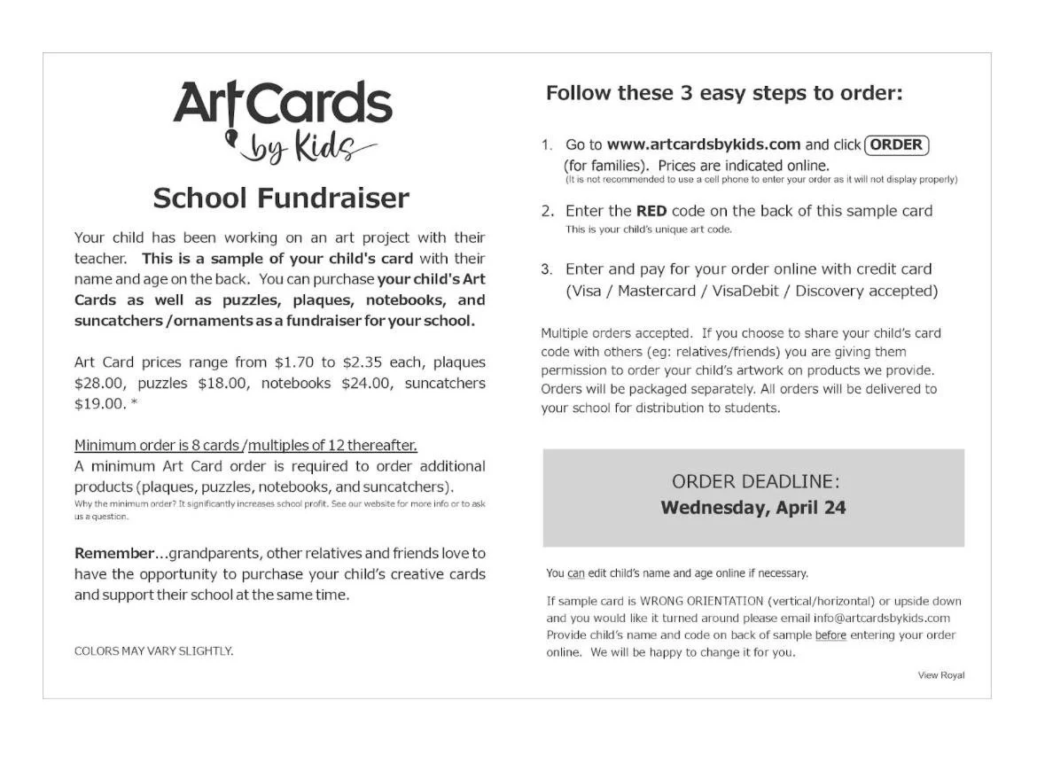 Earlier this year our students created wonderful artwork as part of our school Art Card fundraiser. Their masterpieces have been put on sample cards and go home in backpacks on April 8. Ordering instructions are on the inside of the card.