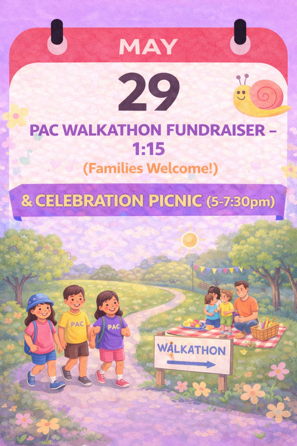 Back to All Events PAC Walkathon Fundraiser Friday, May 29, 2026 1:00 p.m. 2:00 p.m. Google Calendar ICS